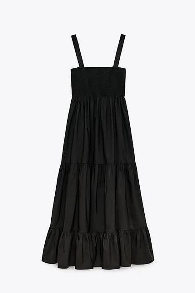 Se trata de un vestido negro de largo midi en tejido popelín caracterizado por una falda fluida formada por anchos volantes y que tiene un bonito cuerpo ajustado, elástico y de nido de abeja, con tirantes y escote recto. Cuesta 29,95 euros y nos encanta por lo ponible que es y porque el cuello que tiene favorece muchísimo a todo tipo de pechos y siluetas.