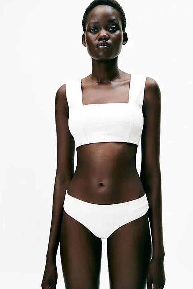 En tejido de otomán blanco, con tirantes anchos y escote cuadrado, este bikini de la nueva colección es uno de los recién llegados a Zara que más éxito está teniendo, y no nos extraña: es muy barato (17.95 euros), su diseño minimalista es perfecto y, además de potenciar el bronceado, es súper favorecedor, porque sujeta muy bien el pecho y lo realza, da igual la talla que tengamos (de hecho, está disponible de la S a la XL).