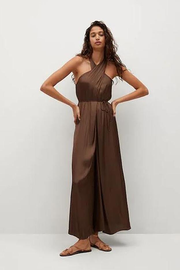 Se trata de un mono satinado, en tejido fluido y en un color marrón chocolate de lo más favorecedor. Es una prenda que lleva un bonito y elegante escote cruzado en la parte frontal que deja los hombros al aire y una espalda muy original. Es de corte recto en la pernera, pero lleva la cintura elástica por lo que hace que siente de maravilla y sea de lo más cómodo.
