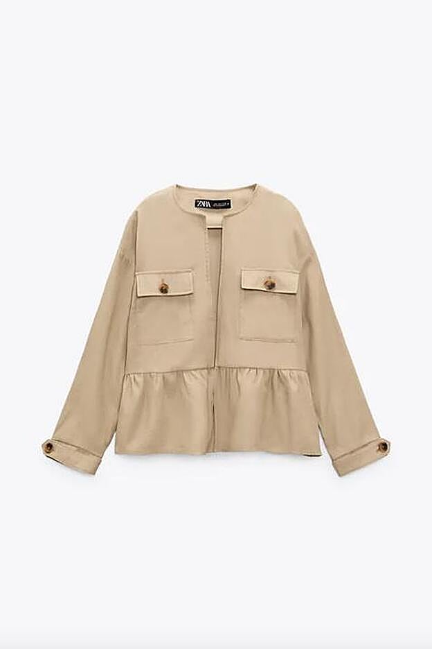 De diseño abierto, con cuello redondo y manga larga, la chaqueta de entretiempo de Zara viene con bajo acabado en volante.