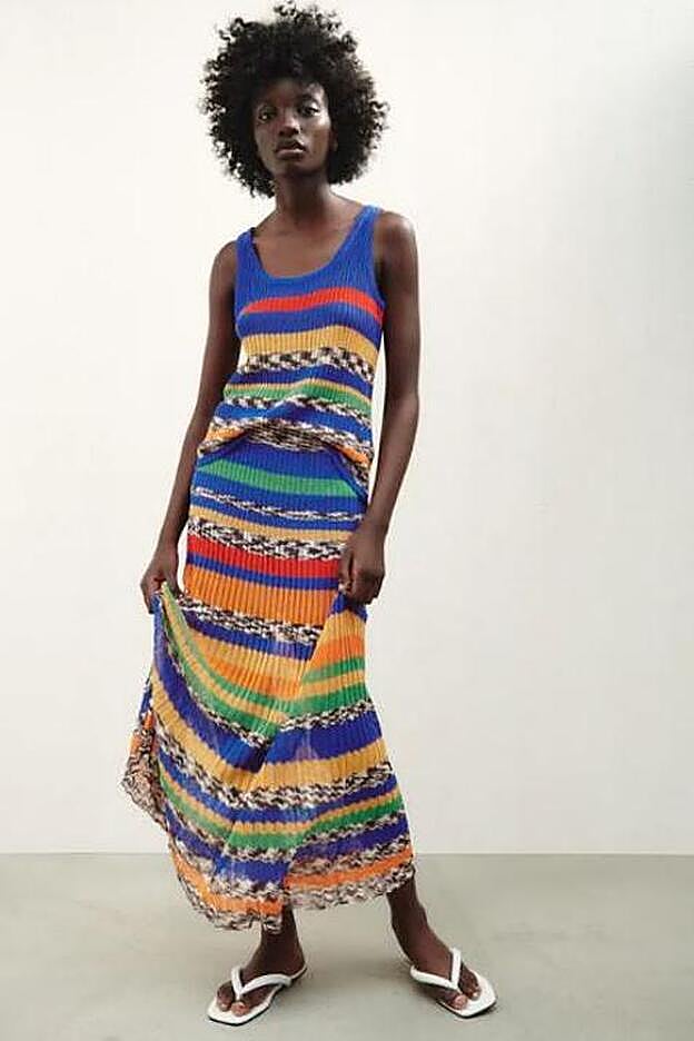 Se trata de un look formado por un top de tirantes anchos y escote redondo que está protagonizad por un bonito tejido de punto en color azul eléctrico con rayas de colores como el verde o el naranja. Una prenda que cuesta 19,95 euros y que tiene una falda larga a juego. En este caso, es un modelo de talle alto, con cinturilla elástica y bajo acabado en línea evasé, es decir, ligeramente acampanada. Esta cuesta 29,95 euros y, como era de espera, ya está agotadísima en la web del gigante de Inditex.