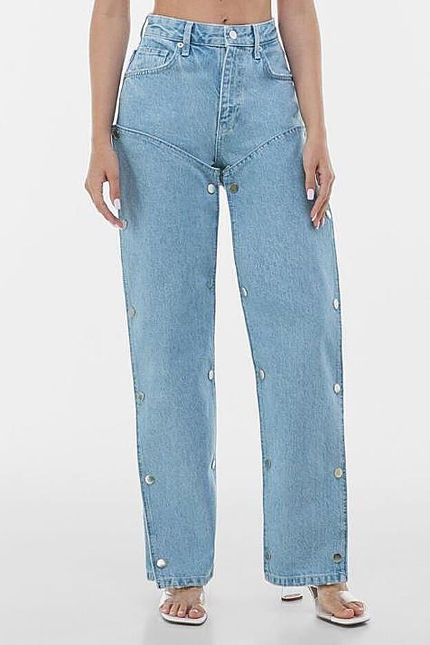 Hablamos de unos pantalones vaqueros de corte recto y talle alto que acaban de llegar a la nueva colección de Bershka. Se trata de un diseño 'straight' en color azul lavado de esos que no te quitas en todo el año porque sientan de maravilla y pegan con todo. Sin embargo, lo peculiar de estos jeans es que llevan unos corchetes a la altura del muslo que sirven para desmontar parte de la pernera.