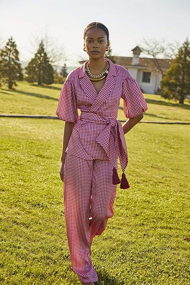 Se trata de un traje de chaqueta confeccionado en twill de Vanderwilde, una marca de ropa sevillana que ha adoptado el estilo de la tradición andaluza para combinarlo con los diseños más modernos y contemporáneos. El conjunto, protagonizado por unos bonitos cuadros vichy en color rojo y blanco está formado por una chaqueta cruzada con cinturón del mismo tejido rematado con dos borlones y manga abullonada al codo y un pantalón recto a juego.
