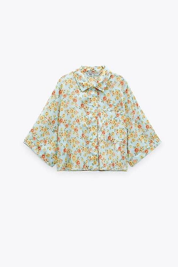 Nuestra primera apuesta es para un acierto seguro que no vamos a dejar escapar de la página web de la firma de Inditex. Se trata de una camisa fluida de corte cropped, cuelo solapa clásico, manga oversize por debajo del codo, bolsillo delantero, bajo asimétrico y cierre frontal de botones. ¿Lo más bonito? Su estampado de flores en tonos rosas y beige sobre un fondo celeste precioso. Lo que nos extraña es que siga disponible en todas sus tallas de la XS a la XXL. ¿Su precio? 29,95 euros.