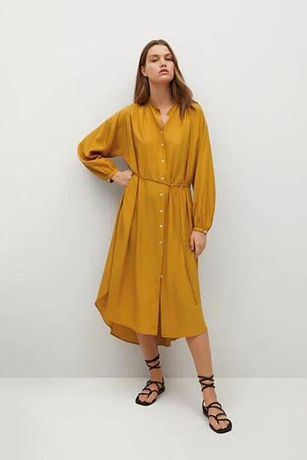 Se trata de un vestido de tejido fluido que tiene un diseño camisero de largo y midi y manga larga. Es de un color mostaza de lo más favorecedor y lleva el cuello redondo con volante mini, detalles plisados y un cinturón con el que marcar la figura y la silueta. Nos encanta además por su bajo asimétrico siendo ligeramente más largo por detrás que hace que sea una prenda aún más especial. Sin embargo, lo mejor de todo es su precio: costaba 39,99 euros y ahora puedes comprarlo por 29,99 euros. ¡No está nada mal!