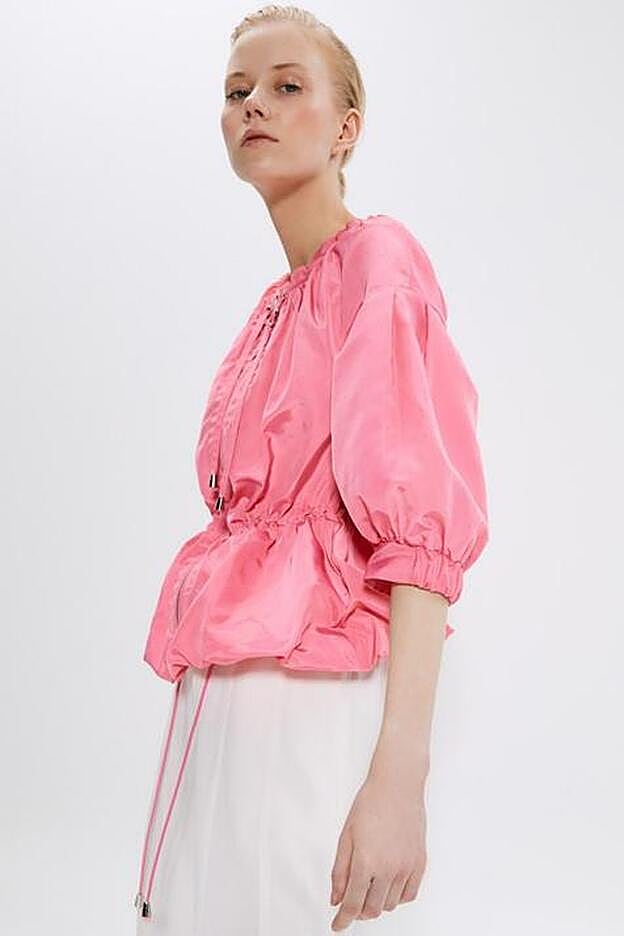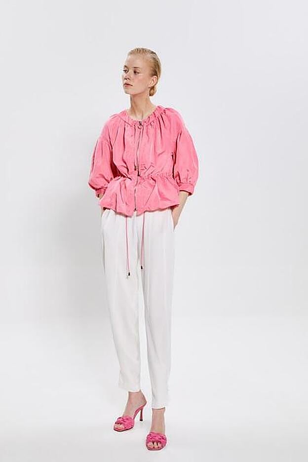 En un bonito rosa pastel, esta chaqueta con costuras de hombros caídas, mangas globo y cintura ajustable lo tiene todo para ser la protagonista inesperada de tus mejores looks.