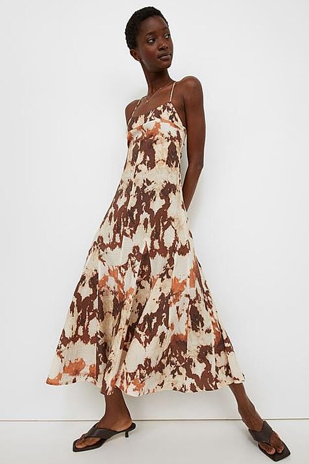 Nuestro favorito es este vestido de Zara en color crudo con estampado étnico en marrón. Confeccionado en tejido con mezcla de lino, viene con escote recto y tirantes finos y tiene dos aberturas traseras en el bajo. Cuesta 29,95 euros y está disponible entre las tallas XS y XXL.