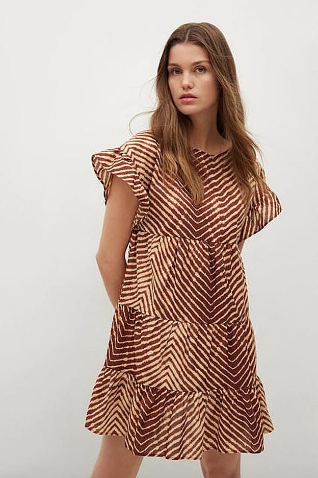 Por último, en Mango y para las tardes más frescas hemos encontrado este vestido corto de diseño acampanado con escote redondo con cordón ajustable, mangas cortas con volante y volante también en el bajo. De diseño fluido, tiene un precio de 29,99 euros y está disponible entre las tallas XS y XL.