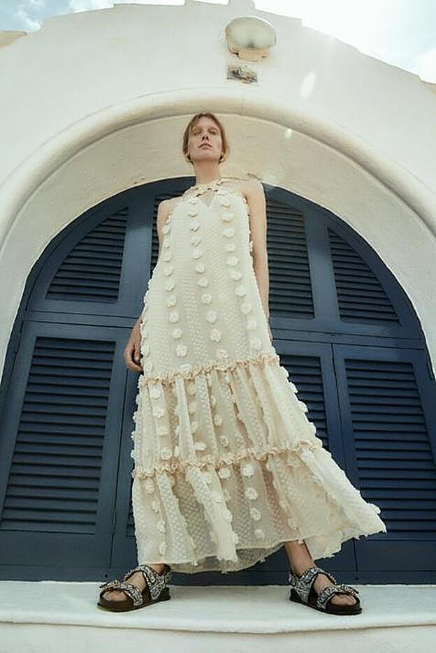 Uno de nuestros favoritos es este precioso vestido en color beige confeccionado en tejido de plumeti especial. Con escote en pico con cruce de tirantes en el frontal y diseño estructurado en la espalda con detalles de rizo, este precioso vestido de Uterqüe podemos encontrarlo en las tallas S, M y L por 159 euros.