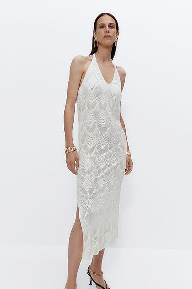 Por último un imprescindible para la temporada de verano, el vestido calado en color blanco. Con escote de pico anudado en el cuello y espalda escotada, este vestido de corte ajustado con aberturas laterales en los bajos tiene un precio de 69 euros y solo está disponible en la talla M.
