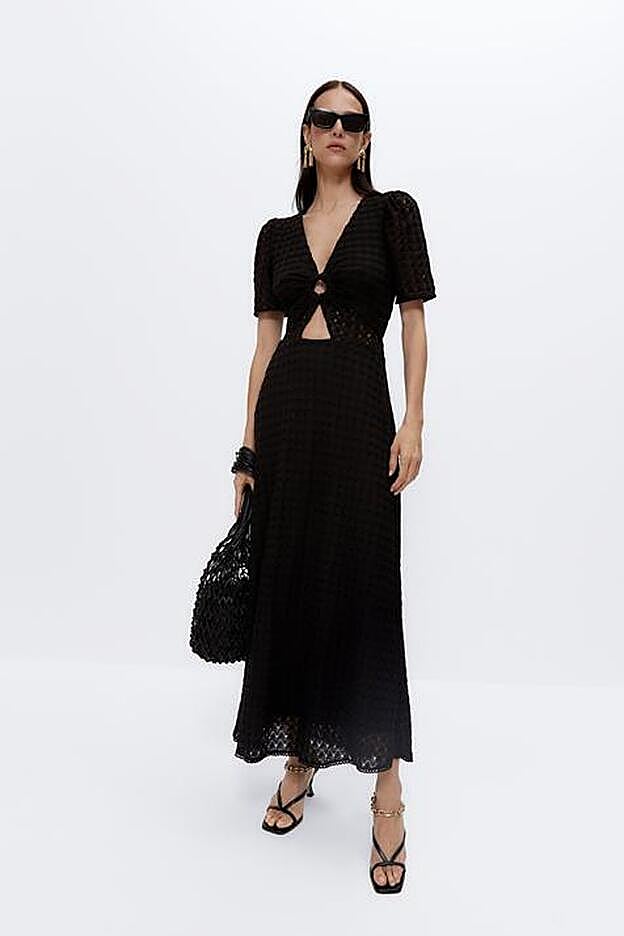 Para aquellas que busquen una prenda funcional que apetece ponerse Uterqüe ha lanzado este vestido evasé en color negro con cuello de pico, anilla en el escote y detalle cut out en la cintura. De manga corta y diseño de bordado inglés, tiene un precio de 99 euros y podemos encontrarlo en las tallas S. M y L.