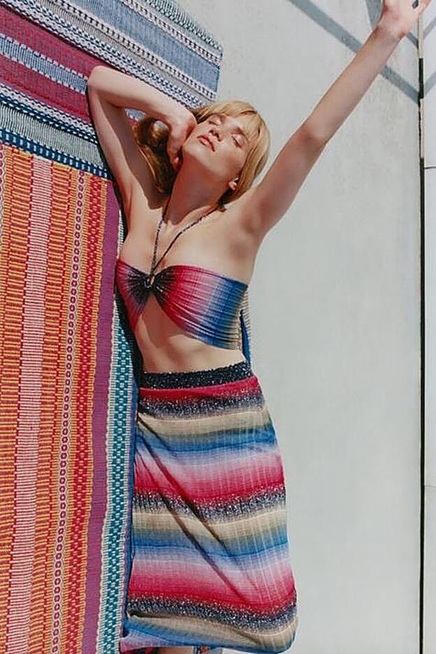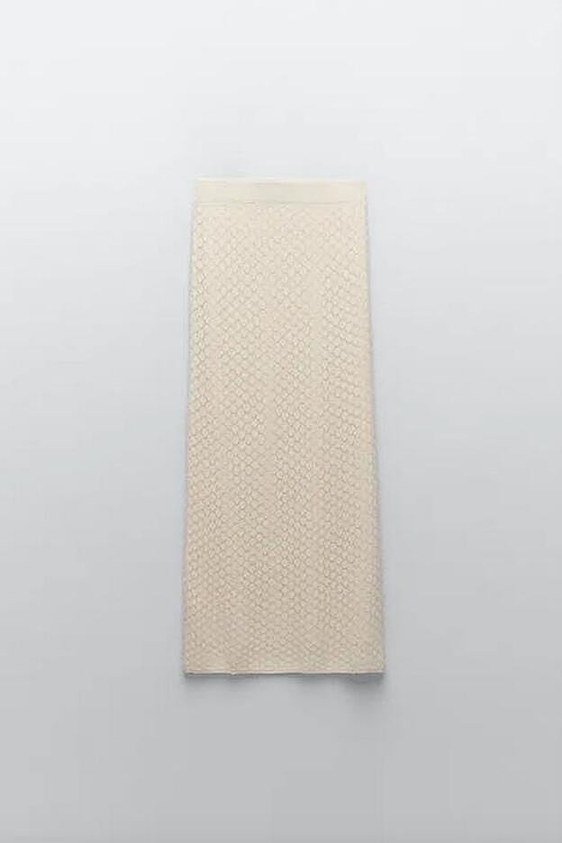 En color crema y punto pointelle, esta bonita falda de tiro alto con cintura elástica y bajo acabado en evasé es ideal para aquellas que se han quedado con ganas de sumarse a la tendencia boho. Cuesta 29,95 euros y está disponible en las tallas S, M y L.