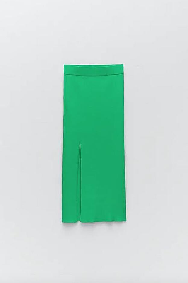 En un verde intenso, esta bonita falda de canalé de punto viene con cintura elástica y bajo con abertura frontal. Tiene un precio de 25,95 euros pero solo queda en las tallas M y XL.