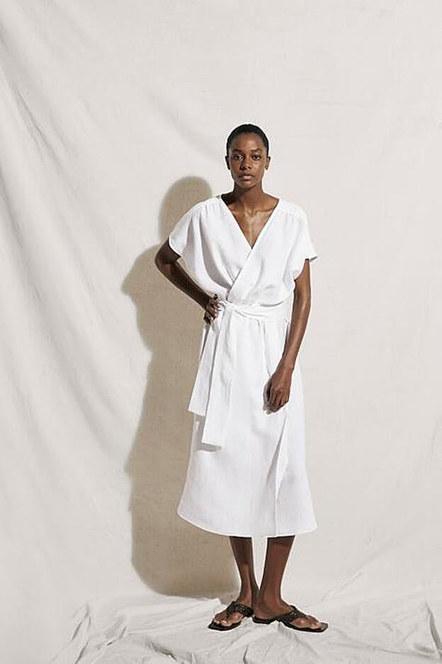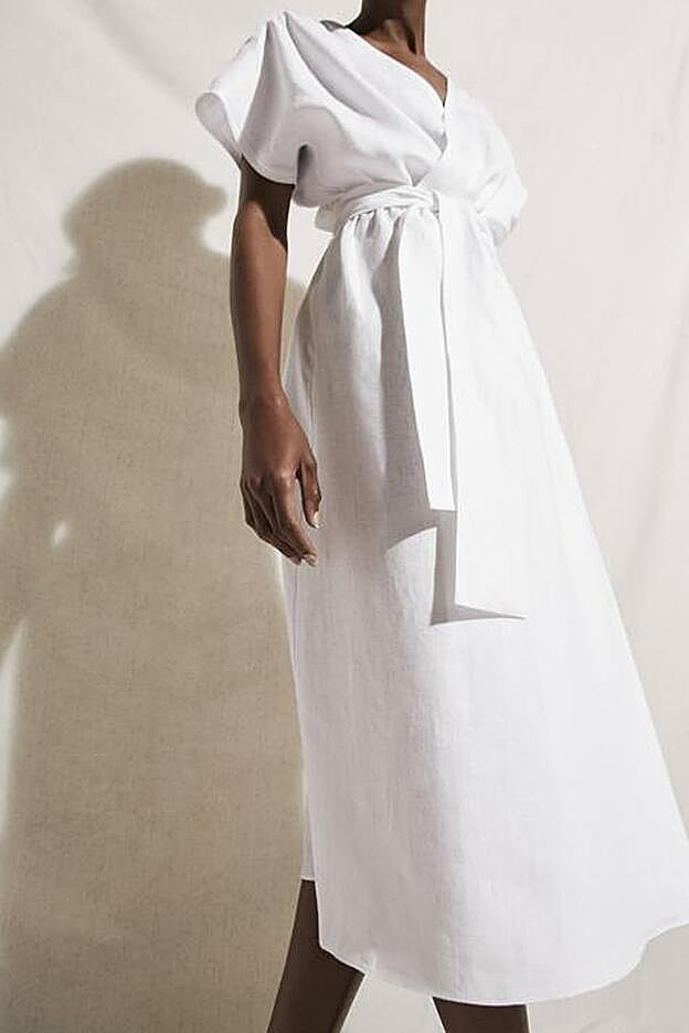 Si buscas algo más tradicional pero igualmente exitoso Massimo Dutti tiene este vestido cruzado de color blanco confeccionado al 100% en lino. Es de corte evasé y viene con cuello de pico y mangas cortas.
