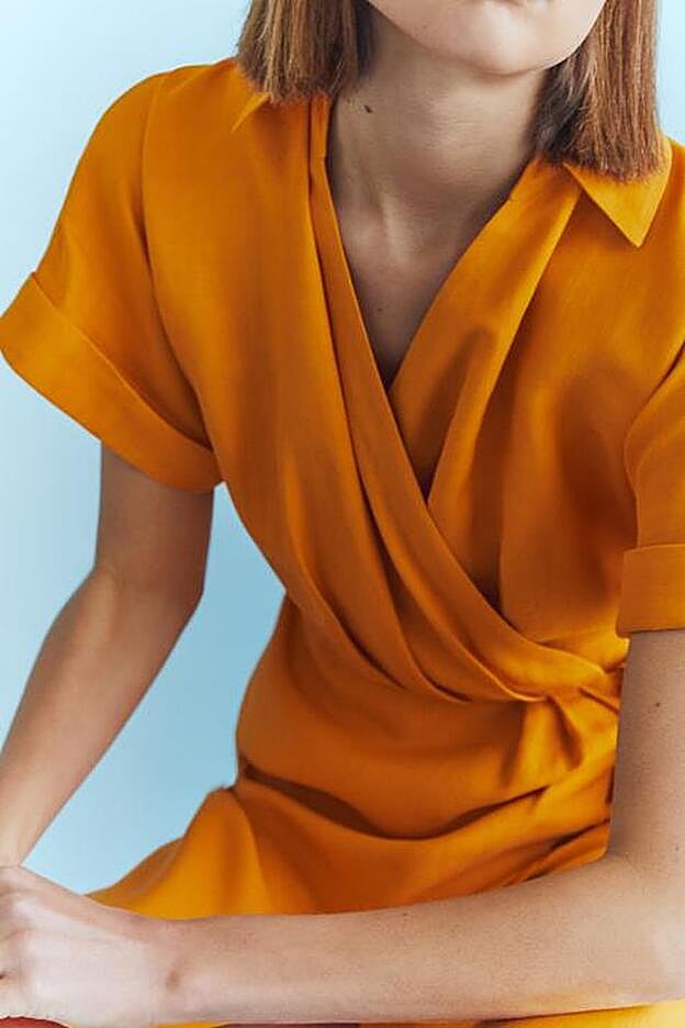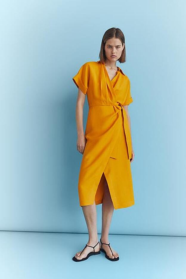 Para aquellas que busquen un vestido en color intenso, este naranja de Massimo Dutti es perfecto. Con cuello tipo polo, cierre cruzado mediante botón lateral y manga corta con vuelta, el cinturón ajustable viene a tono y en estilo lazada.