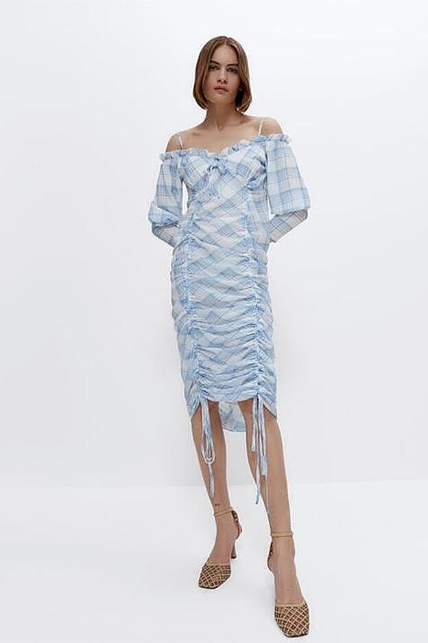 En azul celeste y blanco, este precioso vestido midi confeccionado en tejido con estampado vichy tiene escote de barco y cordones a ambos lados del frontal para poder fruncir y adaptar lo largo del vestido.