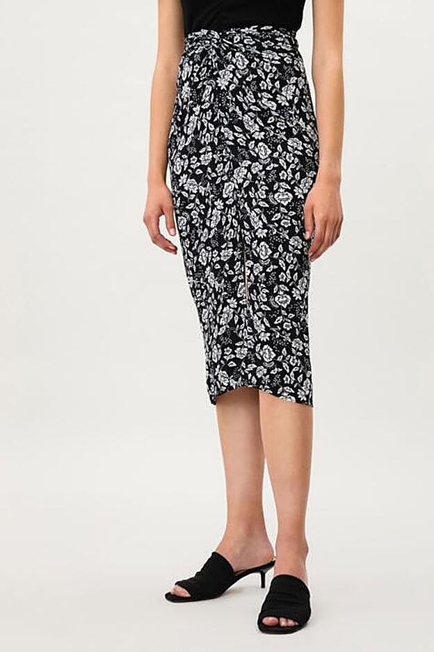 Se trata de un modelo de Lefties que simula un pareo gracias al nudo que lleva en la parte frontal y en la cinturilla. Es un diseño de largo midi, de estampado floral en color blanco y negro, que lleva una abertura frontal y está confeccionada en un tejido muy cómodo y elástica que hace que sea perfecta para llevar en el día a día. ¿Lo mejor de todo? Su precio. Puedes hacerte con ella por tan solo 12,99 euros.