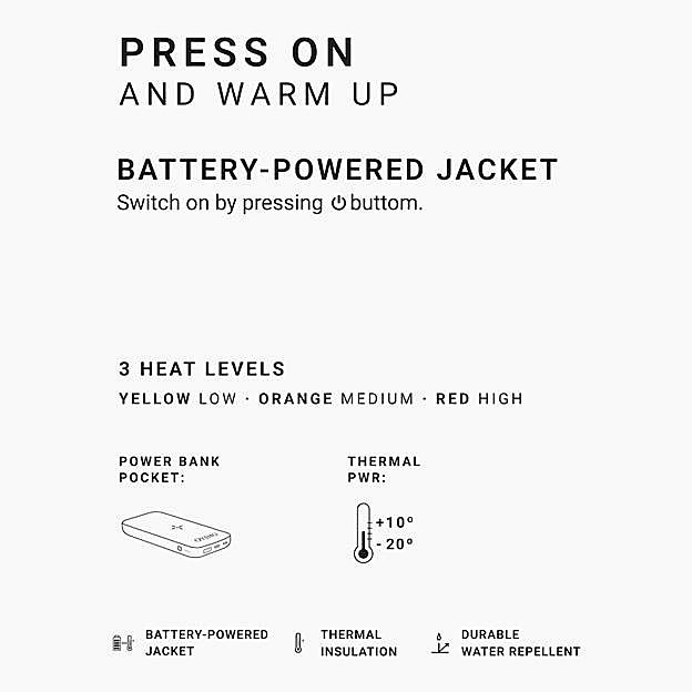 El truco de este abrigo está en que dispone de una batería que está incluida en el interior de la prenda de forma invisible y que permite seleccionar la zona a calentar así como los tres niveles de temperatura: alto, medio o bajo. Maravilla, ¿verdad?