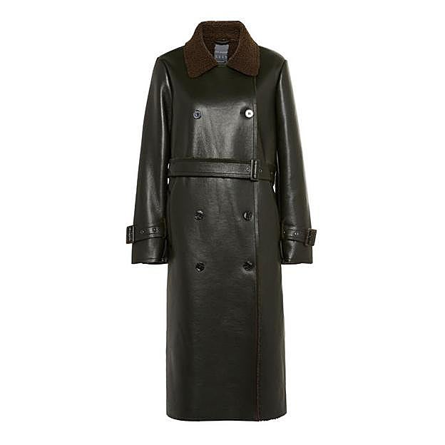 Se trata de un abrigo largo con un diseño tipo 'trench' cruzado, con doble abotonadura y cuello solapa. Sin embargo, nada tiene que ver con una gabardina, ya que es un modelo de efecto piel en color negro que lleva el interior de borreguillo en color marrón oscuro, al igual que las solapas. Es, por supuesto, de manga larga y lleva un cinturón a juego con hebilla para marcar la prenda a la cintura y que quede la silueta más definida consiguiendo un efecto muy favorecedor.