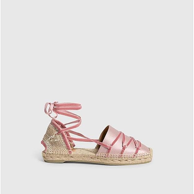 El siguiente modelo está firmado por la celebérrima Castañer. Se trata de unas alpargatas planas con suela de yute y caucho de dos centímetros. La parte delantera está elaborada en tejido de raso color rosa claro. Tiene talonera trenzada con abertura posterior. Y, cuenta con cintas efecto terciopelo en un tono de rosa más oscuro a combinación, para anudar al tobillo. Está rebajadas un 30% y ahora las puedes comprar a 94,50 euros.