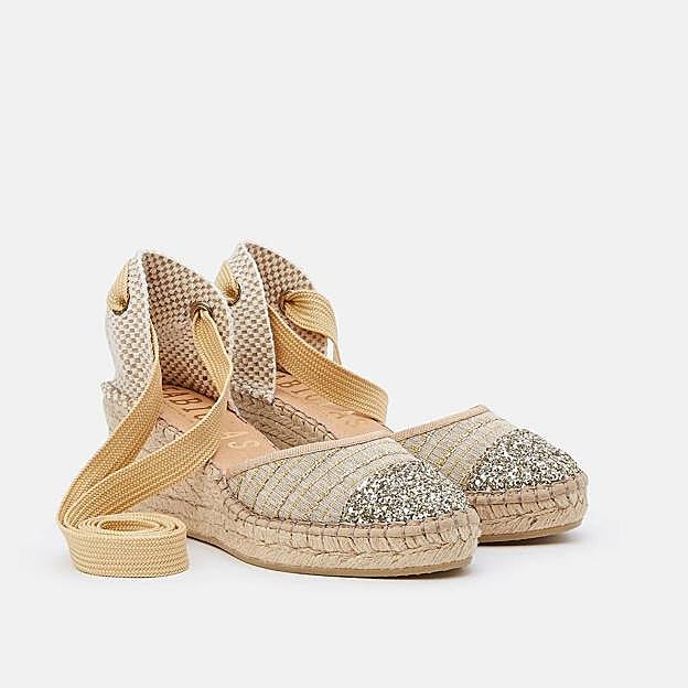 Encabeza nuestra selección este diseño de alpargata con cuña de yute, de 5,5 centímetros, en tonos neutros. Tiene puntera con bordado a rayas y está decorada con aplicaciones de glitter color oro. La talonera es trenzada e incorpora una cinta beige para anudar al tobillo. Están firmadas por la marca Fabiolas. Y, ahora las podrás encontrar con descuento a 53,90 euros.