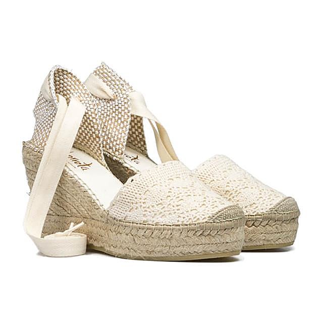 Son unas alpargatas de cuña en color blanco confeccionadas en tejido de ganchillo de algodón con cintas al tono para atar al tobillo. Tienen también una puntera reforzada, que asegura la calidad y durabilidad del modelo y su cuña está fabricada en yute natural.
