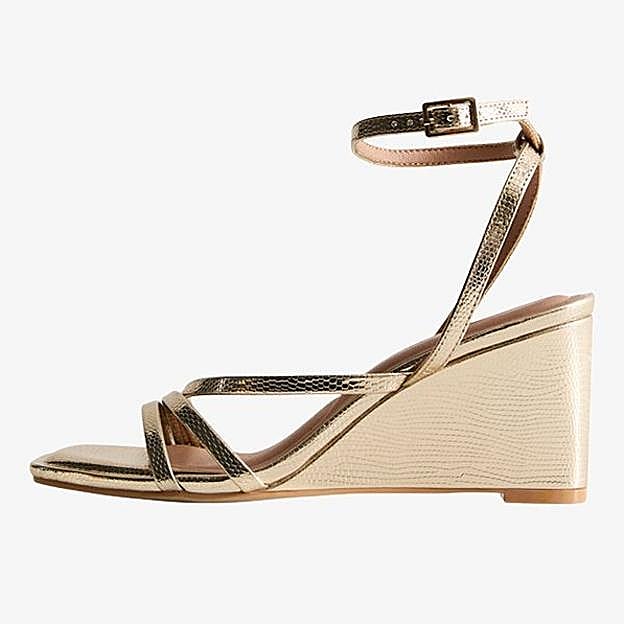 Son unas sandalias de tiras muy finas estratégidamente colocadas para un efecto estilizador en el pie que llevan una cuña con la altura perfecta. Un tamaño similar al de Amal que no es lo suficientemente alto para ser cómodo, pero también para estilizar las piernas.