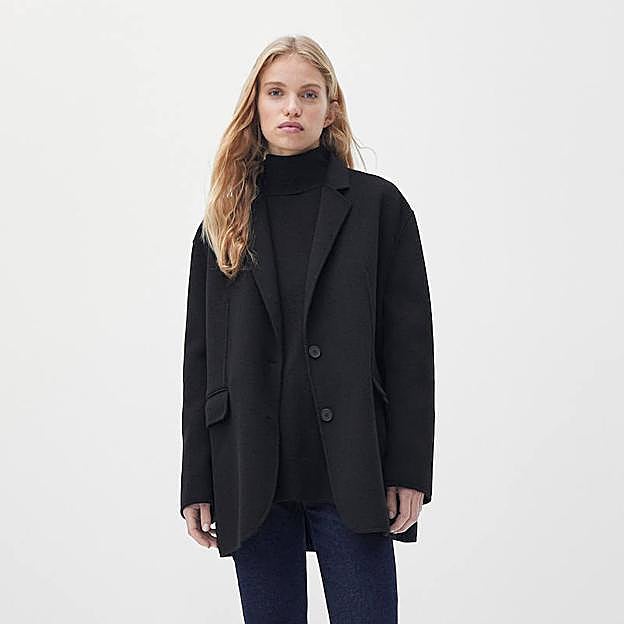 El primer modelo es una americana negra confeccionada en lana con corte oversize, cuelo solapa con muescas, hombros caídos, bolsillos delanteros con solapa y detalles de costuras en relieve, a un pecio de 149 euros (que puedes encontrar rebajada a 119,20 euros). Sobra decir que este básico combina con absolutamente todo, pero su estilo relajado lo hace diferente, perfecto para conseguir ese look 'chic' francés con vaqueros, bailarinas y jersey marinero.