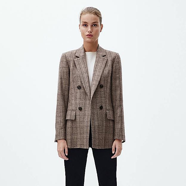 Los estampados son tendencia esta temporada, aunque el de esta prenda siempre será elegante. Se trata de una americana 100% de lana con patrón de cuadros, cierre cruzado mediante doble botonadura frontal, estructura recta y bolsillos, en tono marrón y berenjena, con un coste de 149 euros. Esta blazer tiene una estética retro a la última que hace que quede ideal con jeans tipo 'wide leg' o acampanados, botas cowboy de tacón y un jersey de cuello alto, muy a los años 70.