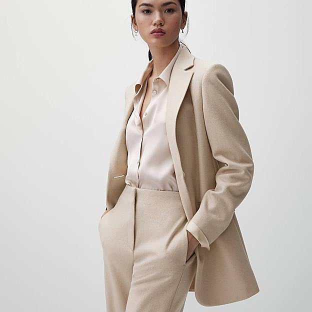 La siguiente es una blazer super especial confeccionada en tejido de lana y seda de morera con hilo metalizado, cuello solapa, tres bolsillos, fit amplio, abertura en la parte posterior y puños con cuatro botones, en color piedra, disponible por 129 euros. Ese detalle de brillo que aporta el hilo metalizado la hace más sofisticada, sin ser llamativa. Ideal con vaqueros y botines o con un pantalón de traje amplio masculino y unos mocasines.