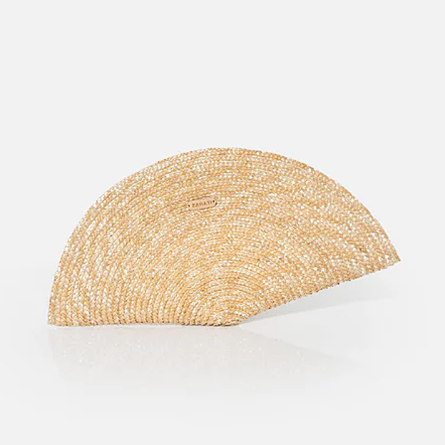 Se trata de un el bolso abanico de Zahati, disponible en ES Fascinante, que está creado con paja de trigo trenzada a mano y que cuesta 45 euros. Ana optó por un modelo en color natural, a juego con las sandalias y con el print del vestido.