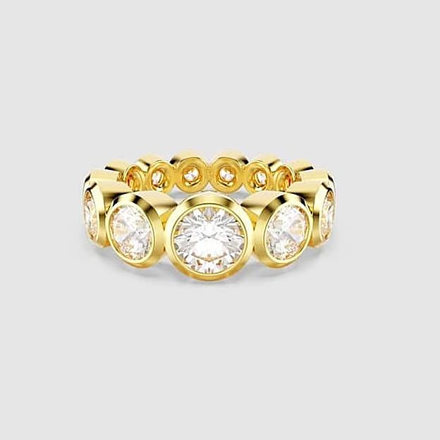 Anillo banda bañada en tono oro con un círculo completo de Swarovski con zirconia en talla redonda, cada una engastada en un moderno engaste bisel.