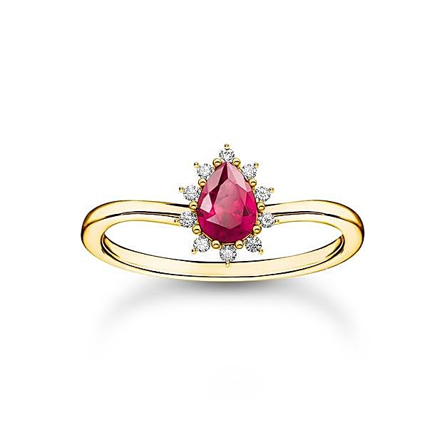 Anillo Vintage Romance de plata reciclada chapada en oro de 18 quilates con un zafiro rojo lab-grown tallado en forma de gota con pequeñas circonitas redondas de color blanco, de Thomas Sabo.