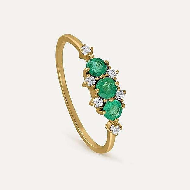 Anillo Tiara Oro confeccionado en amarillo de 9k y adornado con tres piedras verdes y circonitas, de Bea Soldado.
