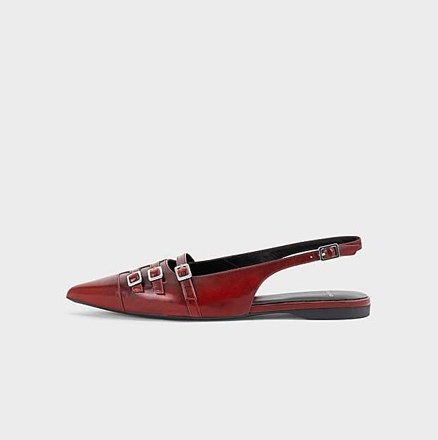Vagabond. Modelo está confeccionado en cuero brush-off rojo con hebillas plateadas, puntera afilada y una tira trasera (120 euros).
