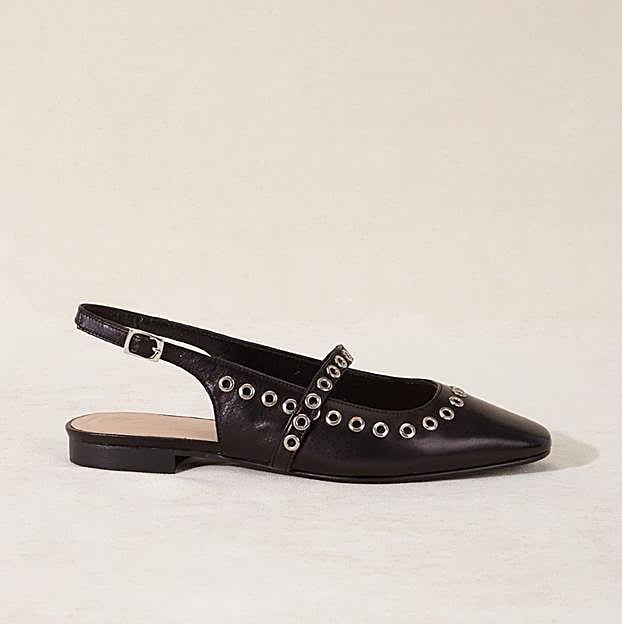 Micuir. Bailarina destalonada en piel negra con eyelets y cierre con hebilla de puntera cuadrada (199,95 euros).