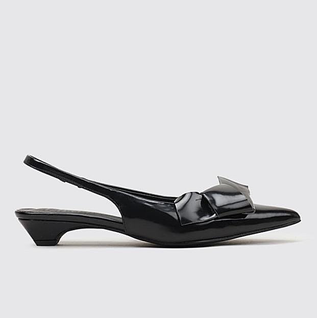 Hune. Bailarina con un tacón bajo, de material con acabado acharolado y el detalle de un nudo en la parte frontal (39,95 euros en Krack).