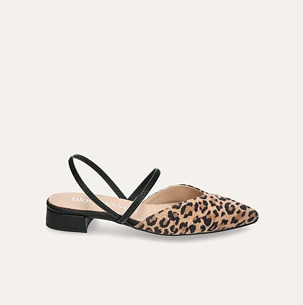 Bloom&You. Zapato plano tipo salón destalonado fabricado en suave piel negra con la pala en ante leopardo (69,90 euros).