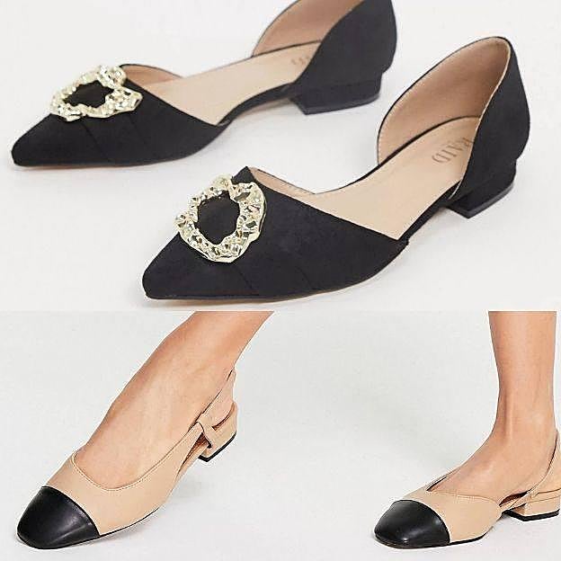 Empezamos por dos versiones versátiles y fáciles de combinar por su neutralidad de tonos. La primera, unas bailarinas terminadas en punta con detalle de broche dorado y aberturas a los lados, color negro, rebajadas a 22,70 euros y a puntito de agotarse. La otra opción, un modelo que imita al icónico de Chanel. Unas bailarinas destalonadas con tira trasera y puntera redonda a contraste, en beige y negro, con un coste de 22,99 euros.