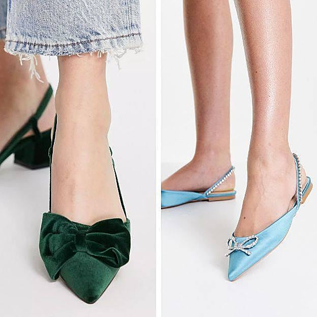 Terminamos con dos modelos, también en los tonos de la temporada y con detalles que las hacen muy especiales. Elige entre unas bailarinas destalonadas y acabadas en punta confeccionadas en tejido satinado, con lazo y tira trasera de strass, color azul, con un coste de 17,45 euros. O, estas bailarinas destalonadas con tacón ancho y bajo muy cómodo, acabadas en punta y con complemento de lazo, en terciopelo verde, a un precio de 35,99 euros.