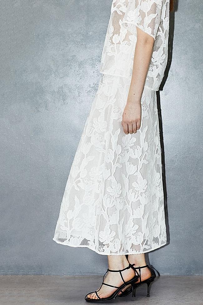 Falda de red con encaje de flores de color blanco. Es un diseño midi y acampanado súper tendencia.