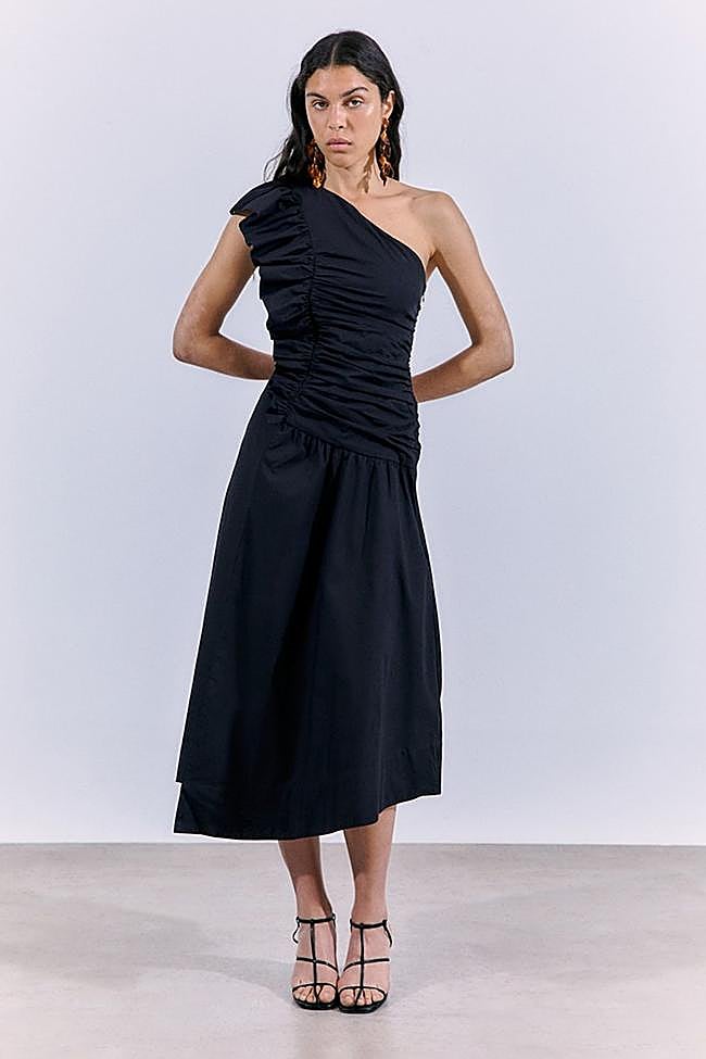 Vestido midi con escote asimétrico y el detalle de un drapeado en la cintura que acaba en volante.