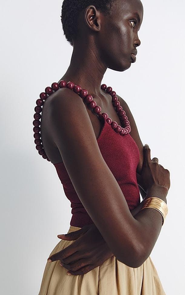 Top de tirantes en color burdeos adornado por unos abalorios de madera.