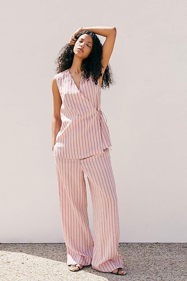 Conjunto de rayas con pantalón ancho y top tipo chaleco cruzado con lazada.