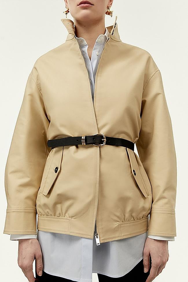 Chaqueta tipo bomber en color beige y confeccionada en un tejido impermeable.