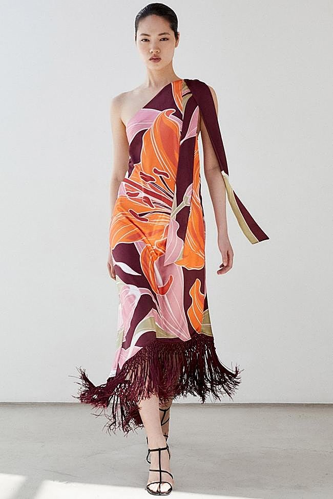 Vestido de invitada con diseño asimétrico, estampado de flores y el bajo acabado en flecos.
