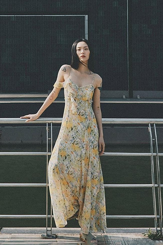 Vestido largo de tirantes con estampado de flores y el detalle de jaretas y volantes.