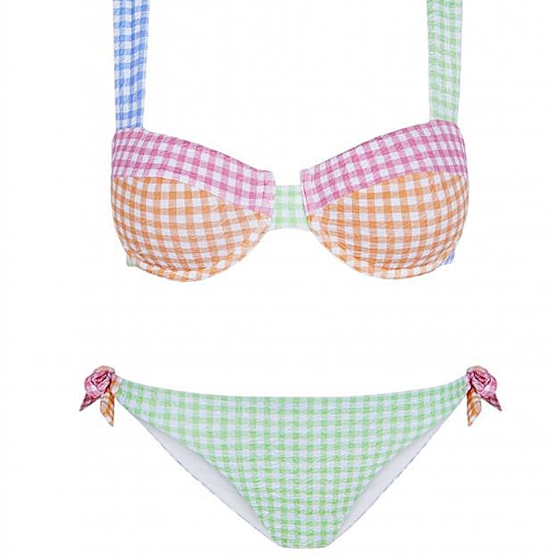 «Tras el éxito de este patrón el año pasado, os proponemos varias opciones, descubre Margot, con un vichy multicolor en estructura», explican desde la marca en la presentación de este bikini. Es un bikini de top balconette con aro y foam y tiras anchas para una perfecta sujeción y una braguita forrada delante y detrás, regulable mediante lazo.