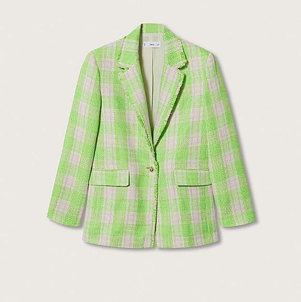 Hablamos de una americana fabricada en tejido tweed y protagonizada por un estampado de cuadros vichy en color verde claro y blanco. Tiene un diseño, recto, largo y estructurado que va acompañado de un cuello en forma de pico con solapas, manga larga y cierre de botones metalizados en la parte frontal y en las mangas. cuesta 79,99 euros y además, lleva el detalle de las solapas desflecadas que le dan ese toque casual y diferente.