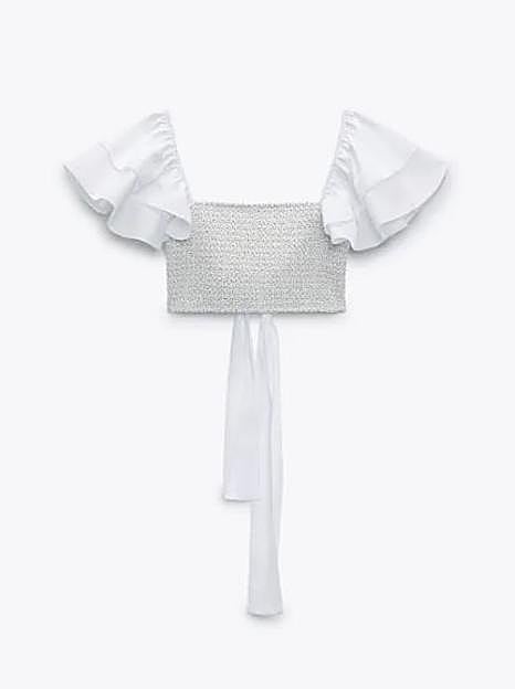 Lourdes añadió un top cropped en color blanco con cuerpo de jaretas y mangas con volantes de Zara. Un diseño precioso y muy ponible que, sentimos decirte, no está disponible (al menos en la web de Zara). No sabemos si se trata de una prenda de rebajas agotada o que simplemente es de otras colecciones, pero lo que sí sabemos es que ahora mismo hay disponible un diseño muy similar. Tiene el cuerpo fruncido, las mimas mangas y queda anudado en la espalda con una lazada XL. Y, ¿lo mejor de todo? Que cuesta tan solo 15,95 euros.